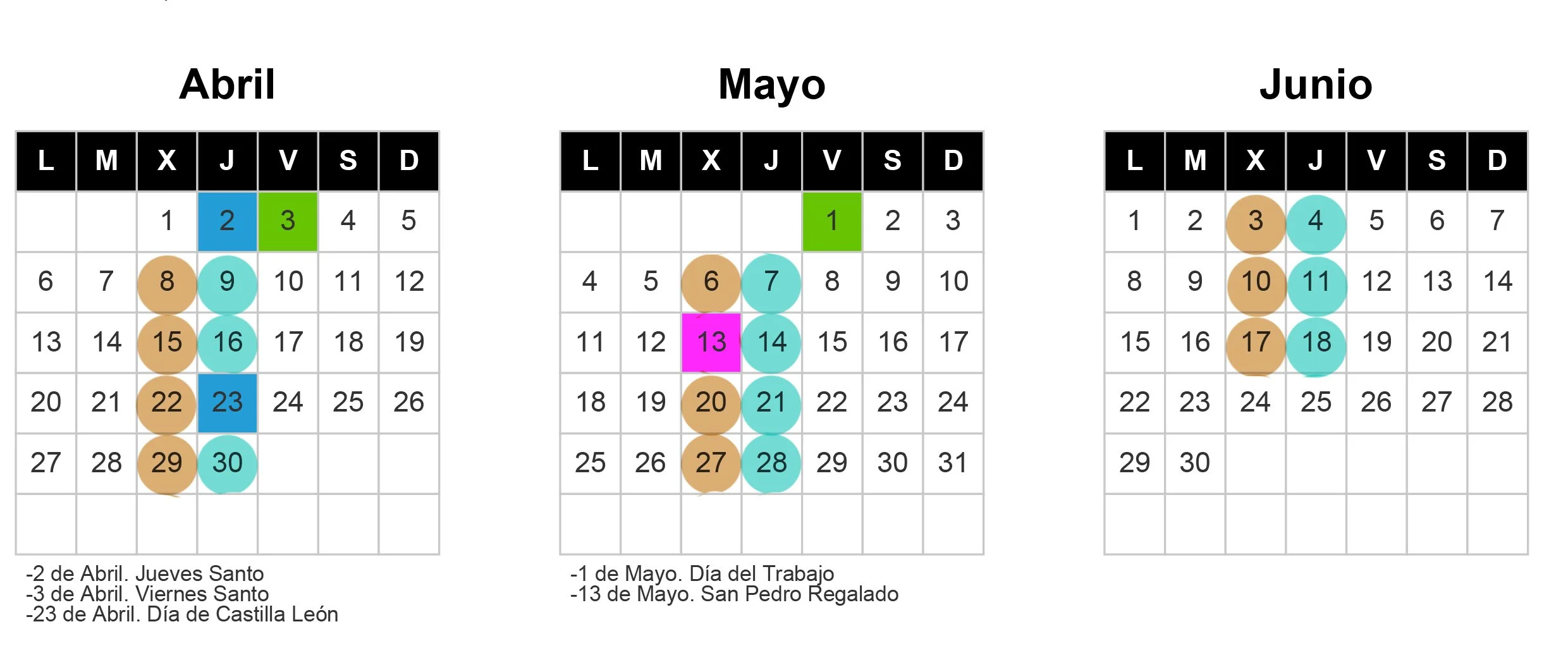 Las clases siguen el calendario laboral oficial de Valladolid, por lo que no hay clase en festivos ni durante las vacaciones de Navidad y Semana Santa.